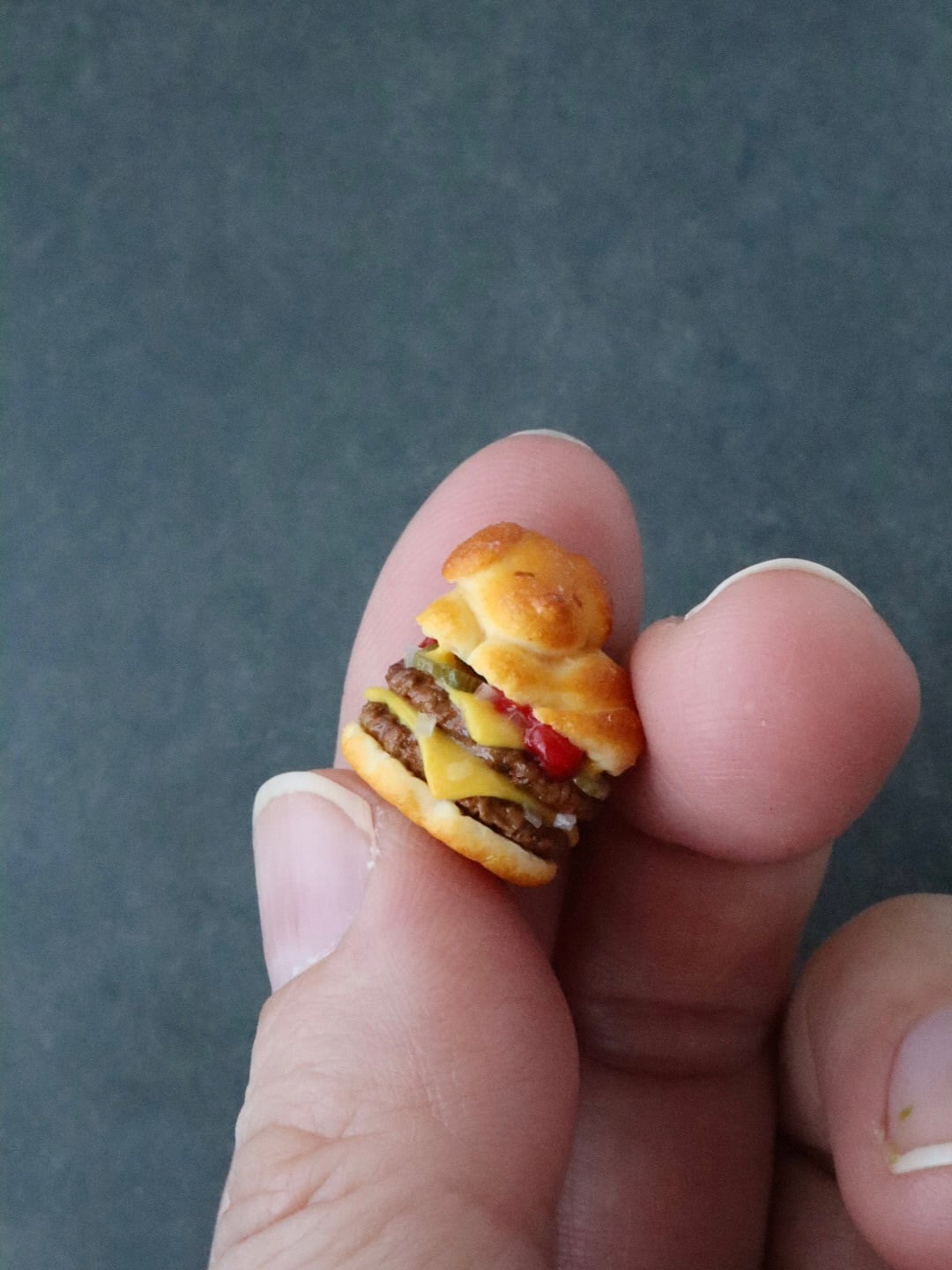 肉肉しいパティにとろりと熱で溶けてるチーズ、ケチャップとマスタードで味付けして、ピクルスとオニオンを味のアクセントに…細部までこだわりを詰め込んで制作した美味しそうな作品。