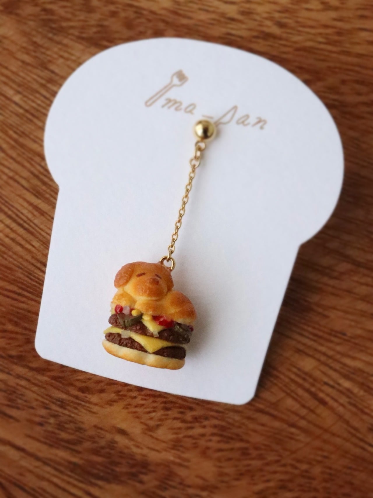 幸せそうに丸まってうたた寝するイヌさんのバーガーをアクセサリーにしました。