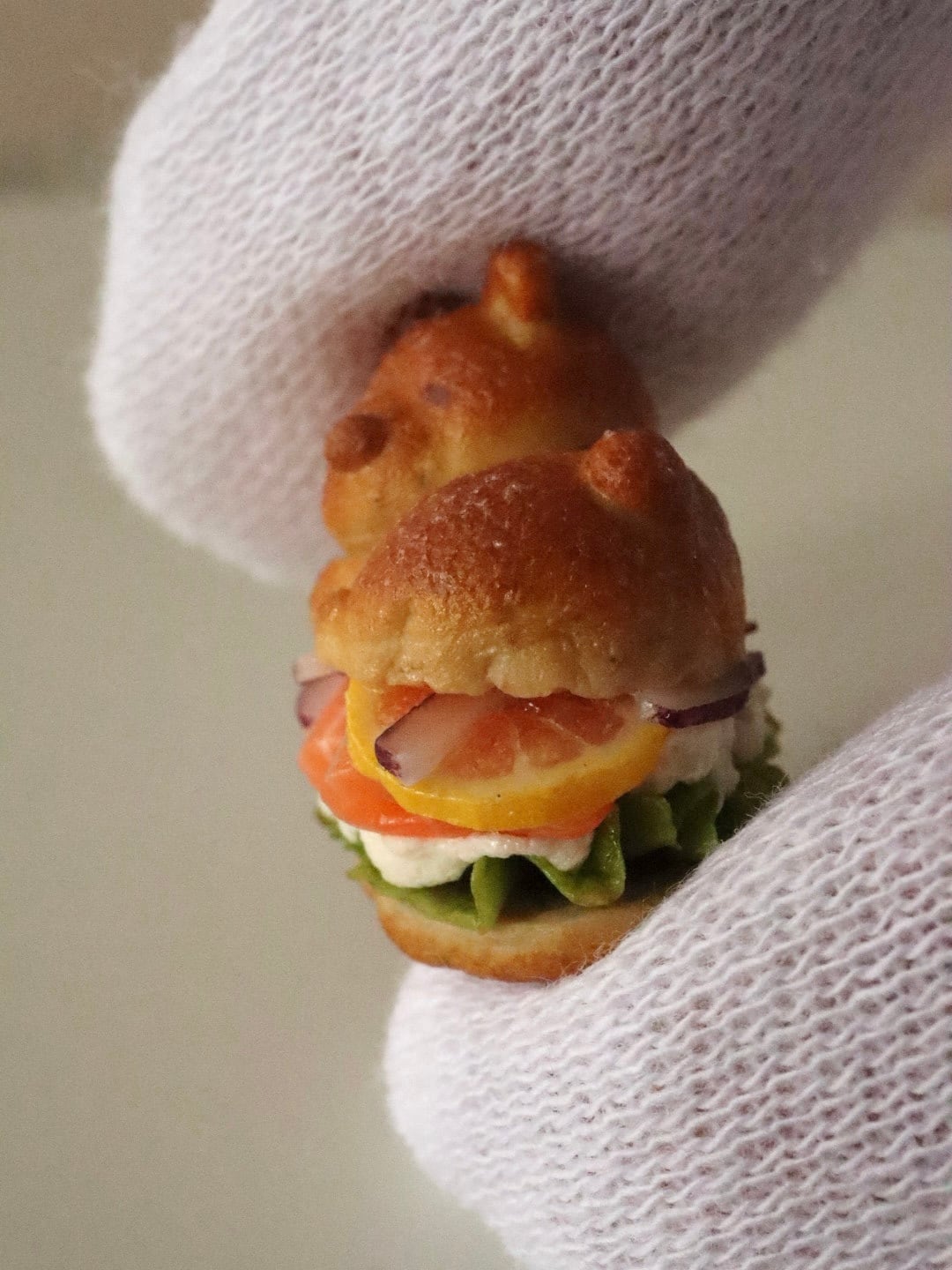 フレッシュなレタスにたっぷりクリームチーズ、サーモンを乗せて、赤玉ねぎとレモンで爽やかに…細部までこだわりを詰め込んで制作した美味しそうな作品。