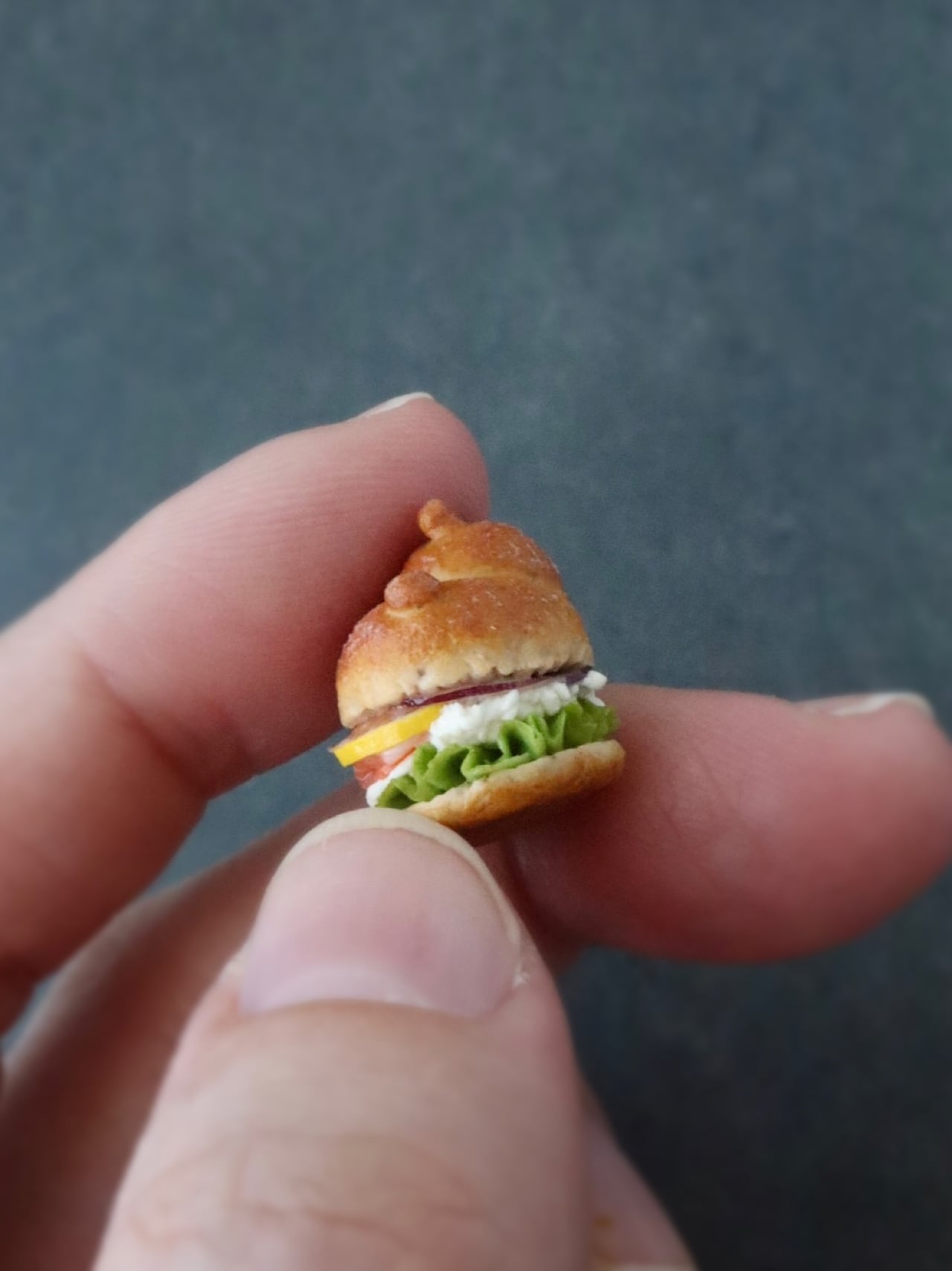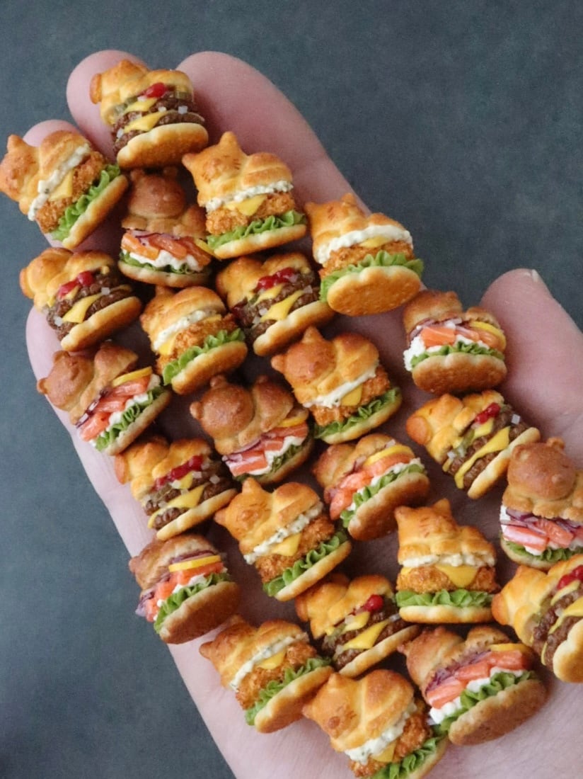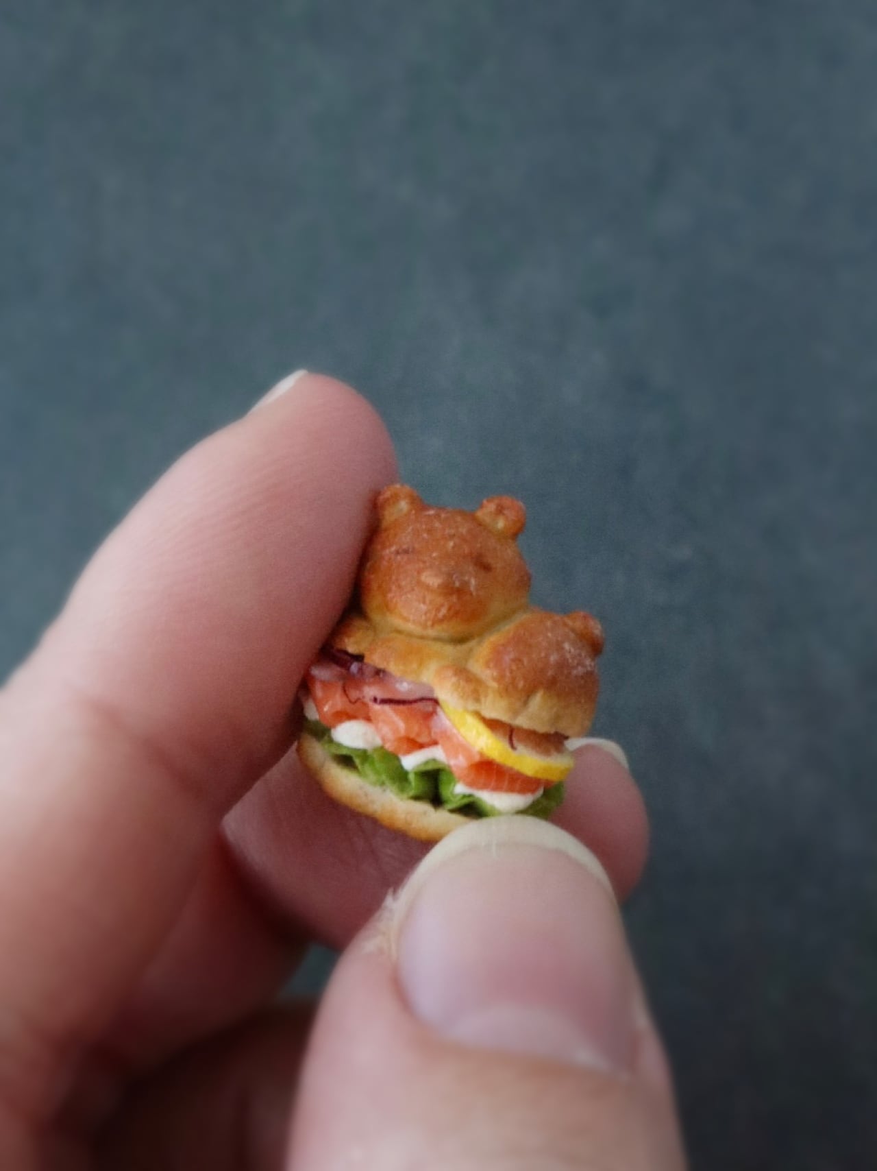 幸せそうに丸まってうたた寝するクマさんのバーガーをアクセサリーにしました。